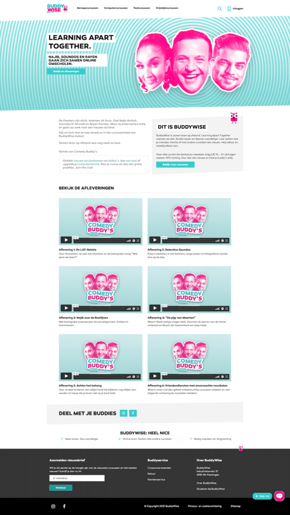 Voor de introductie van budget-aanbieder Buddy Wise, schakelden we Najib Amhali, Soundos El Amhadi en Rayen Panday in. Samen met hen schreef ik 6 afleveringen van een comedy-serie” Comedy Buddy’s. In de serie laten zij zich omscholen omdat Corona de theaters dichthoudt en het werk (zogenaamd) opdroogt. Zij zoeken cursussen uit, duiken erin en doen aan elkaar verslag van de vorderingen. En passant bedenken ze ook nog even het thema-lied voor Buddy Wise.